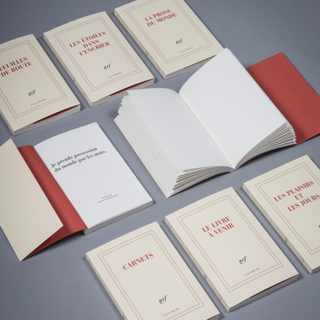 Chaque carnet Gallimard possède des pages légèrement lignées, s’ouvre par une citation extraite de l’œuvre dont il est le reflet, signée du nom de l’auteur, et se clôt par un rappel de l’histoire de la collection blanche. Toutes les couvertures sont imprimées sur du papier Tintoretto 200 g/m², fabriqué spécialement pour les Éditions Gallimard par Fedrigoni (maison fondée en 1888).