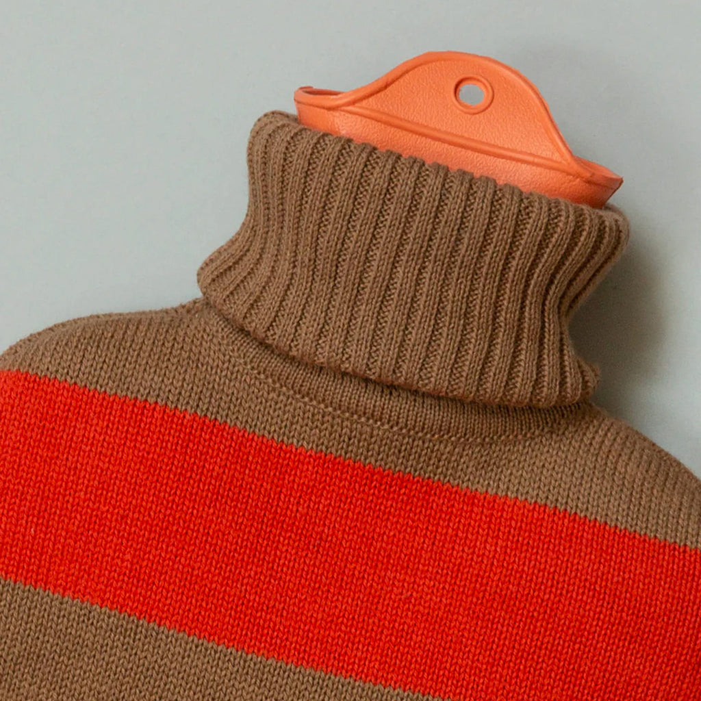 La bouillotte orange est en caoutchouc latex naturel et la housse rayée rouge/marron en coton biologique. La housse se retire grâce à une fermeture dans le fond. En plus de vous réchauffer, elle ajoutera une touche de couleur à l'ambiance hivernale de votre maison.