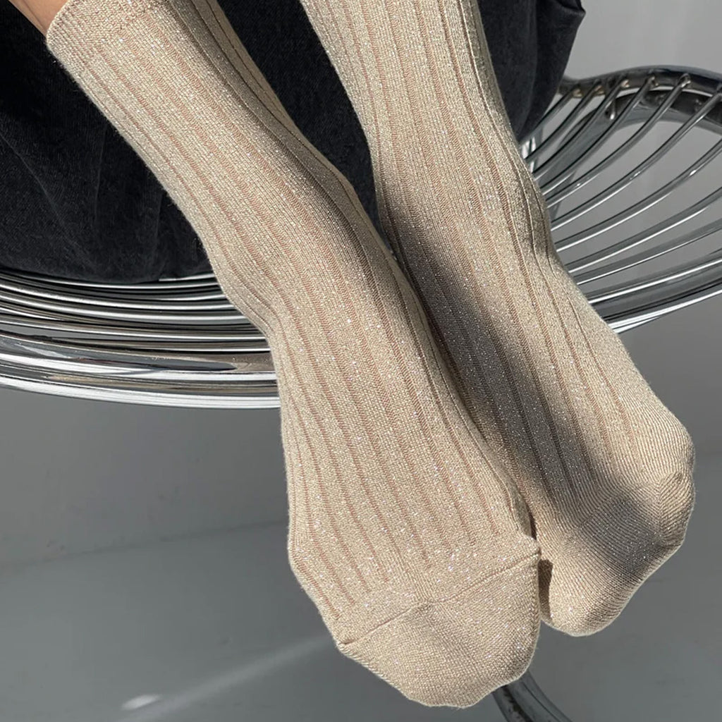 Avec leur maille côtelée classique et leur longueur mi-cheville, ces chaussettes sont parfaites pour twister un look du quotidien ou briller en soirée.